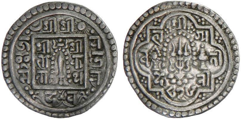 Obverse: 2 letters on both sides of square. In the names of Jaya Indra Malla and Queen Bhagyavat